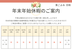 年末年始の営業日のお知らせ 投稿公開日:2025年12月3日 投稿カテゴリー:イベント / お知らせ 日頃よりご利用いただき誠にありがとうございます。誠に勝手ながら、年末年始の期間につきましては一部店舗にて休業日を設けさせていただきます。 お客様にはご不便をおかけいたしますが、何卒ご理解賜りますようお願い申し上げます。詳しい営業日程は、下記の営業予定表をご確認ください。 新年も皆さまのご来店をスタッフ一同、心よりお待ちしております。引き続きご愛顧のほどよろしくお願い申し上げます。 おすすめ 9月の営業日のお知らせ 2024年9月2日 期間限定「信濃地鶏の鶏塩そば」 2023年9月27日 5月の営業日のお知らせ 2025年4月29日